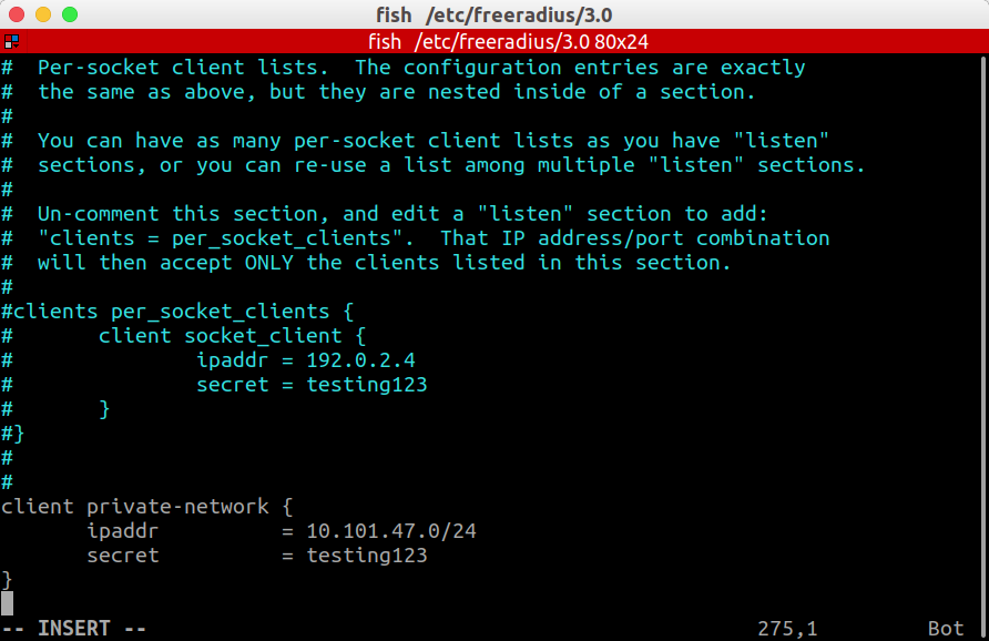 修改clients.conf: (這個檔案主要是限制哪些client可以使用FreeRADIUS server)